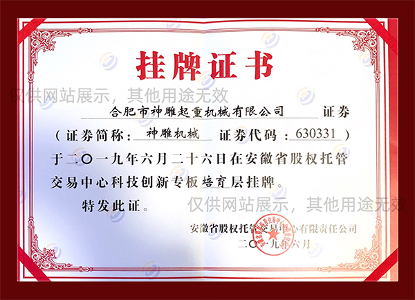 合肥神雕起重是高新技術企業(yè),是安徽省科創(chuàng)板掛牌企業(yè)(證券代碼:630331),同時榮獲安徽市場質量、誠信五星級企業(yè)、合肥經濟圈示范企業(yè)、合肥市創(chuàng)新型企業(yè)、安徽省市場質量放心產品等榮譽稱號